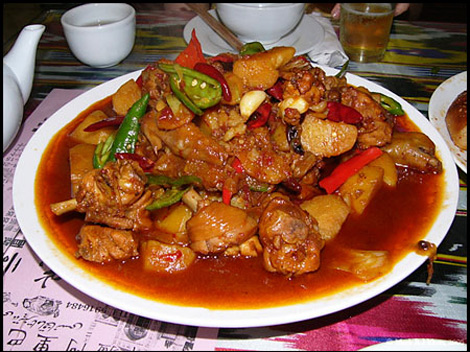 The version of "dapanji" at the "Tianshan" restaurant. Here the flavours are slightly different and the dish has more onion, but still with the principal spicing of chilli, Sichuan pepper, and, most importantly, Star anise. Less chilli oil as a base, so the sauce is less red in colour. At the Tianshan, they will serve the dapanji on a bed of "nang" bread 'like this, if you wish. The bread soaks up the sauce and is exceedingly "more-ish". Photo: mafh.com