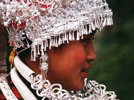The Miao people invest their assets in silver jewelry, in the form of the ornately carved collars, lockets and bangles worn by Miao women, in accordance with the belief that, "women should be adorned with silver and flowers,"on their wedding day and other grand festive occasions.